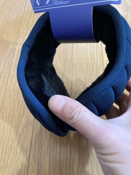 ↓こういう感じに頭の後ろから耳に掛ける構造のイヤーウォーマーです。頭の上にかける形のより、かけたり外したりが楽だし、つけてる時も邪魔になりにくいかな、と思います。
