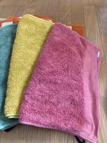 ↓ちなみにこちらが以前スタンダードプロダクツで買ったフェイスタオル。もう2年前くらいだと思います。こちらも一枚300円でした。色が気に入ったんですよね~。随分使いましたが、そんなに色も落ちないし全然問題なく使えてます。