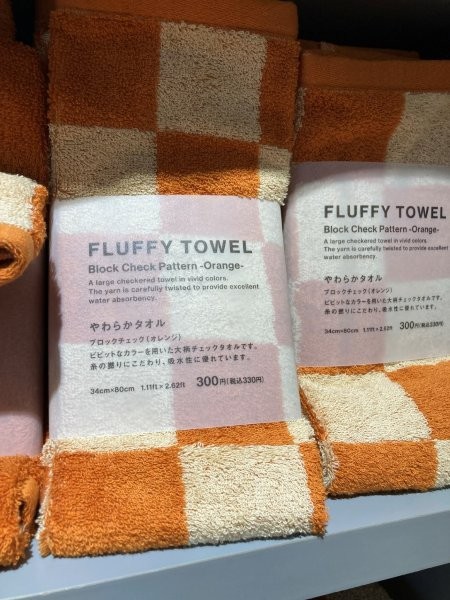 ↓いやー、フワフワでいい手触りです。こちらは小さ目のバスタオルで、500円。フェイスタオルは300円です。FLUFFYって、「やわらかい」とか言う意味です。
