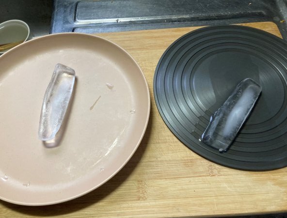 すると、、おおお~、全然違いますね。解凍プレートの方はガンガン溶けていきます。